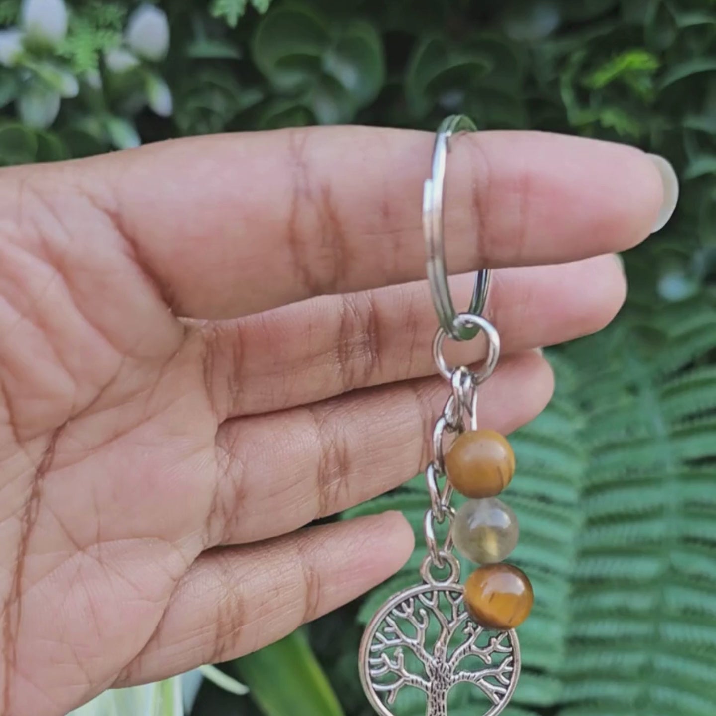 Emporte avec toi la force de la Terre et la limière du soleil. Ce porte-clés allie Oeil de tigre, labradorite et Bois fossilisé pour t'offrir protection, confiance et ancrage à chaque instant, avec l'élégance intemporelle de l'arbre de vie.